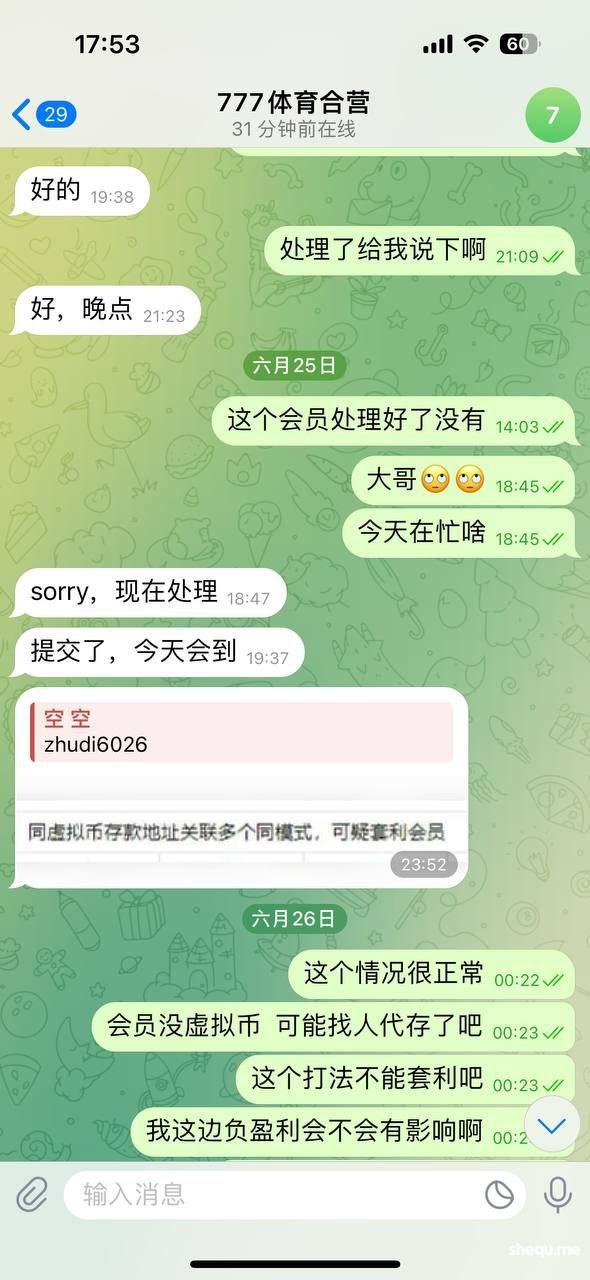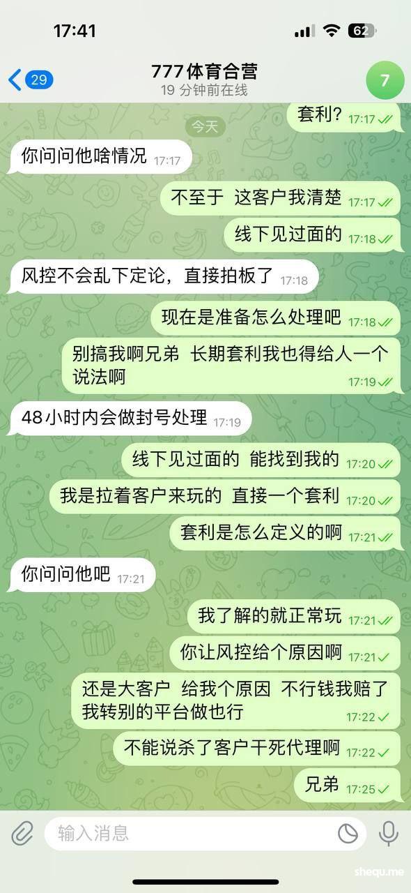 该玩家上月玩的真人输钱了,今早凌晨最后一场欧洲杯玩家想下大额捞亏损,下注决赛大1.5,喜中小两万,凌晨提款到下午十多个小时,后询问招商被告知我该会员长期套利,可是我会员长期未拿过彩金,何来套利?他的注单都是真人体育无任何异常。刚开始做777体育还很忐忑,被告知他们是集团包网,也就放松了警惕心,希望大家以我为鉴