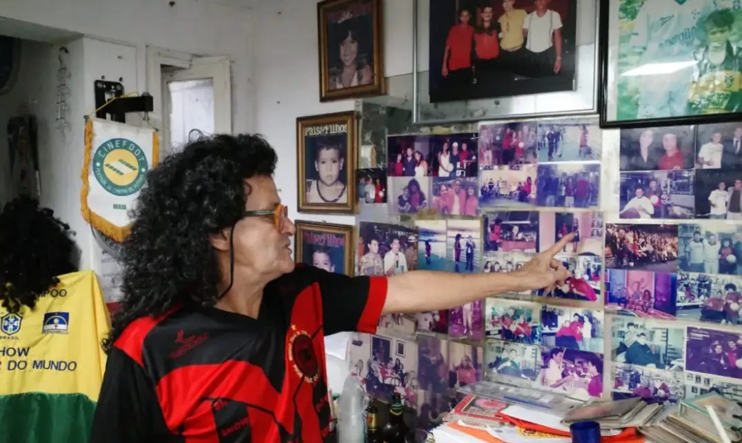 这家理发店就是一切的见证,它就像一座宝库。这里有毛罗·香波玩偶、毛罗·香波T恤、毛罗·香波假发。还有粉丝的留言、打印出来的表情包,以及他为前巴西国脚小儒尼尼奥和埃尔纳内斯理发的照片。还有一张关于他的两部电影之一的宣传海报。他给这家理发店起的绰号用红色字体写在玻璃正面:香波竞技场。旁边是一只朱鹭的木制模型和一件由1994年世界杯冠军成员之一里卡多·罗查签名的巴西队球衣,再旁边是一张小报纸剪报。他用马克笔在上面写了“SHOWSHOW