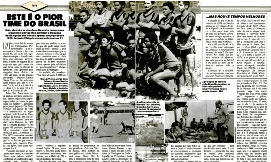 我们能说的是:55场比赛已经够多了,1428天也够多了。这些数字让宜必思队进入了巴西全国的视野中。19836月,《Placar》杂志刊登了跨页报道,这标志着宜必思已经成为“烂队”代名词。此后几十年,有关“世界最差球队”的传播度越来越广。