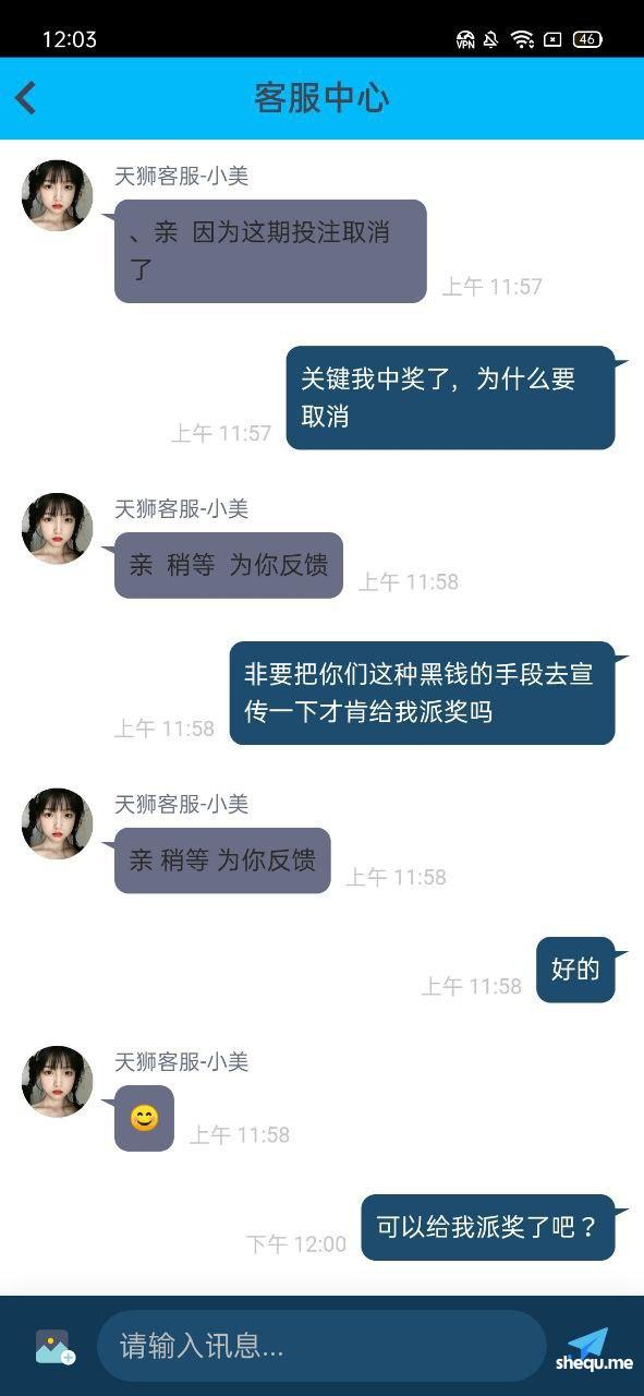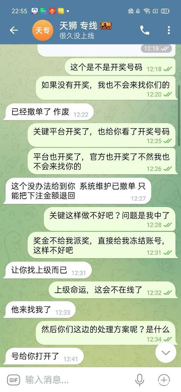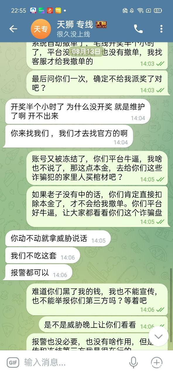 本人今年3月份在天狮娱乐打新澳门六合彩亏了8万,8月13号登陆平台账号有130块钱玩了一下平台的奇趣腾讯qq分分彩,买了三星复式单挑中奖了,差不多奖金九千多,平台直接给我撤单,找了专线和上级,专线和上级都说是碰巧维护,我投注的时候没有维护正常下注的。结果中奖了平台给我来了句,碰巧维护撤单处理,我要求平台给我奖金,不但不给反而把我账号给冻结了。大家记住天狮这个杀猪盘,只能输不能赢,中奖就撤单,而且冻结账号。希望有高层出来处理这个问题,黑了九千多块钱,如果没人才处理,就一直曝光,曝光到你们有人出来处理。