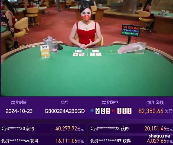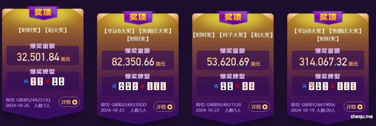 10月末AG百家乐奖池迎来连续爆奖,22日开出383,010.16元大奖,23日再爆免佣庄与幸运6大奖588,223.45元,26日凌晨4点再开出232,156.19元和大奖。大奖频出,参与者喜获巨额奖金,AG百家乐“三宝”玩法助你跃升锦鲤,体验暴富魅力。