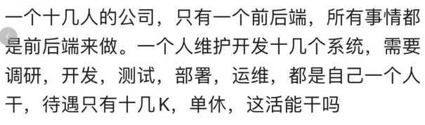 再比如,还有一个码农表示,一个人维护开发十几个系统,需要把调研、开发、测试、部署、运维的都都干了
