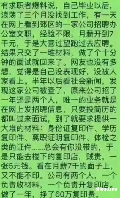 求职者进去面试,被面试官要求打印一大堆材料再来,然后求职者一般会找到就近的打印店去打印。然后持续重复这套流程,靠着打印赚的盆满钵满。